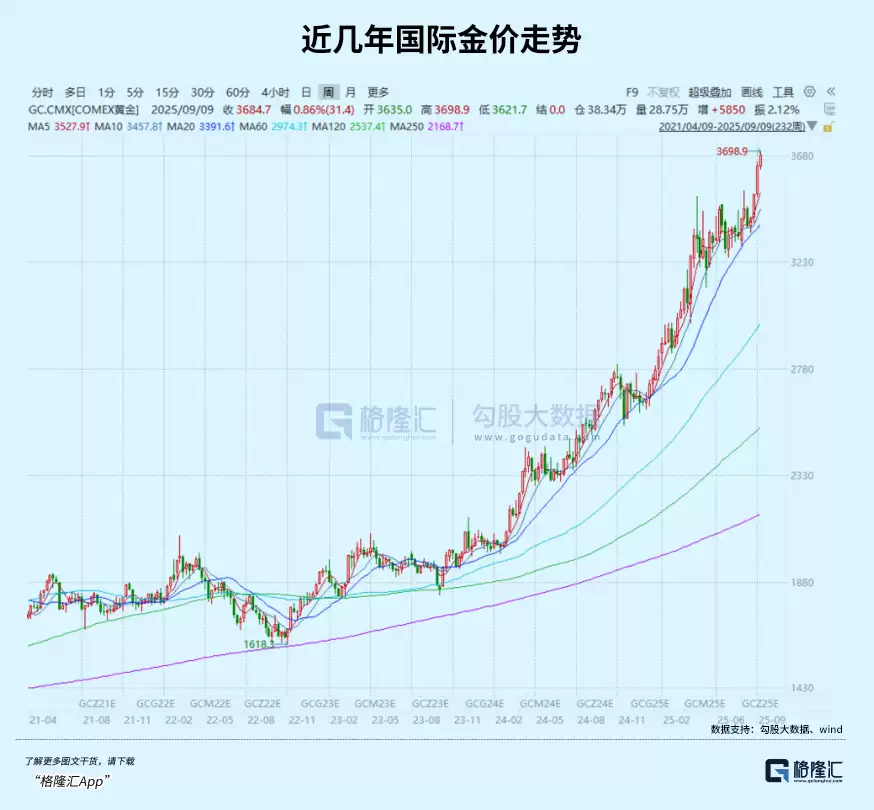 以国际黄金价格为例,2024年初时金价还在2000美元/盎司的区间波动,这一区间是从2020年来就一直盘整,用时3年多。但2024年开始,金价开启一路震荡大涨模式,到今年7月再次突破3450美元调整区间并连续多日加速上涨,今天2025年9月9日盘中无限触及3700美元。