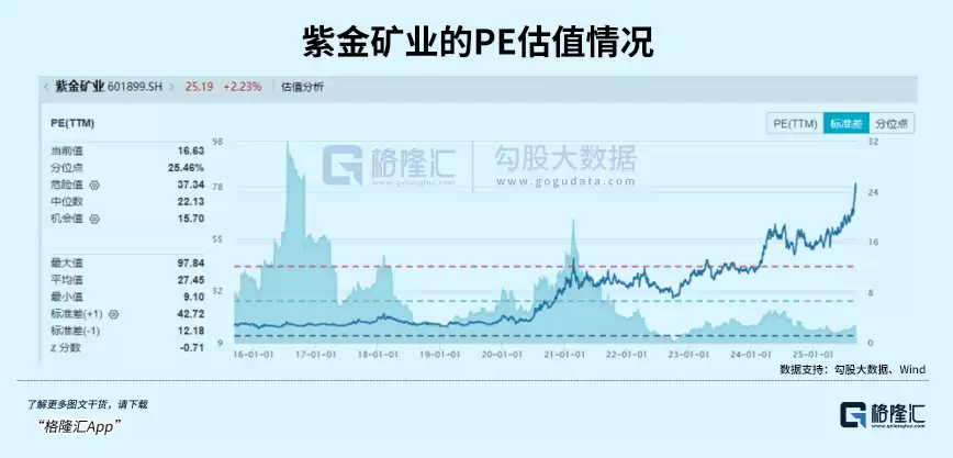 比如紫金矿业,虽然在今年涨幅翻倍,但目前动态市盈率16.6倍,位于近十年25.46%分位点。在金价持续上涨,铜价有望稳健上涨的趋势下,这样的估值并不显得高。