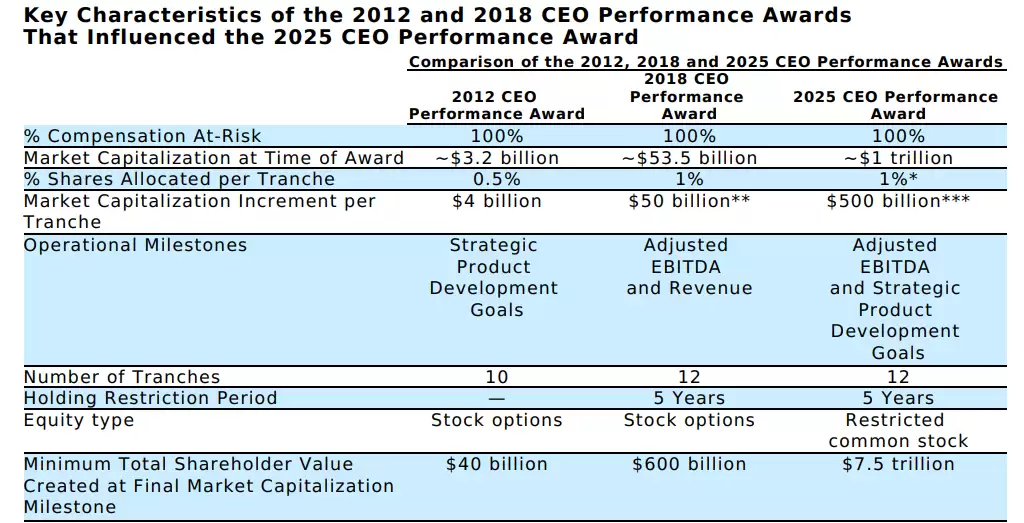 总的来说,新的阶梯式薪酬方案将最多授予马斯克额外4.237亿股特斯拉股权。但拿到这些股票的大前提,是特斯拉市值和业务规模必须达到一系列门槛。