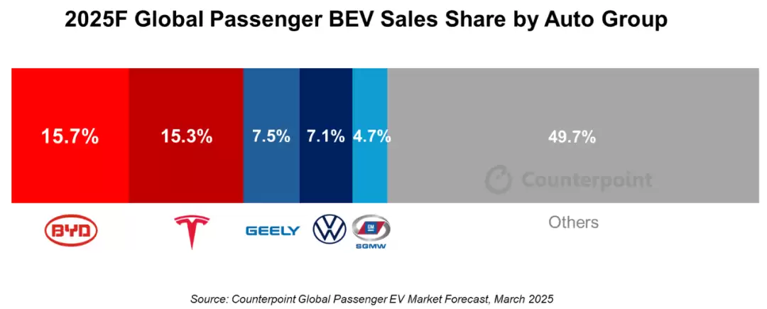 与此同时,全球新能源车市场已经告别“狂飙时代”。TrendForce预测2025年增速 21%,2026年再降至14%。而中国新能源车企已强势崛起,市调机构Counterpoint Research在报告中指出,比亚迪预计将在2025年首次超越特斯拉,成为全球领先的纯电动汽车品牌,占据15.7%的全球市场份额。