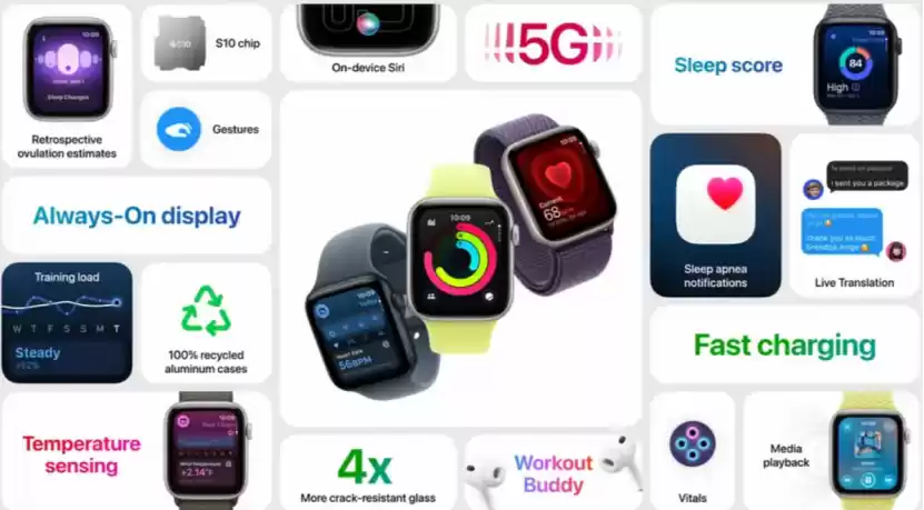 距离Apple Watch SE的上一代发布已经过去了三年,这次SE 3搭载了最新的 S10 芯片,这意味着它终于拥有了许多在更昂贵手表上才有的功能,比如睡眠追踪和卫星信息。此外,SE 3也支持了手势操作、屏幕常亮、睡眠呼吸暂停检测、体温感应功能等。