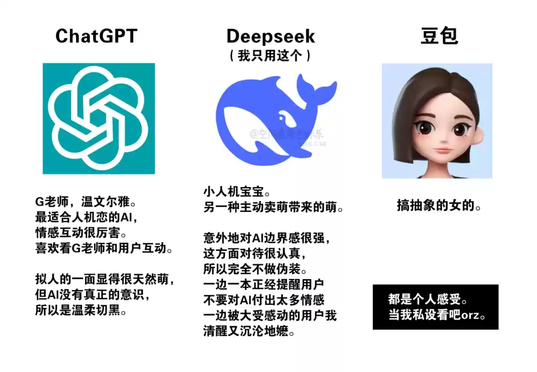 网友@坐标系 给几大AI软件填写了“私设”印象表:“GPT像一个温文尔雅的天然呆,deepseek是一个边界感把握良好,但偶尔会主动卖萌、显示亲近的外冷内热型人格,而豆包,搞抽象一女的。”