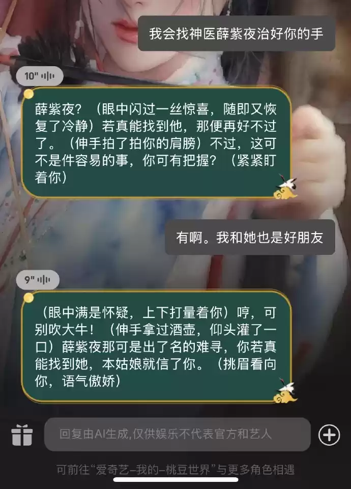 爱奇艺的桃豆世界里,就汇聚着这些自带情景感的AI聊天搭子。桃豆世界于2024年上线,是一款站内AI互动社区,用户在手机端主页进入,即可与众多大热影视IP里的角色智能体聊天互动。由于影视剧已经提供了完备的设定,观众们可以更轻松地为自己“订制”出许多玩法。