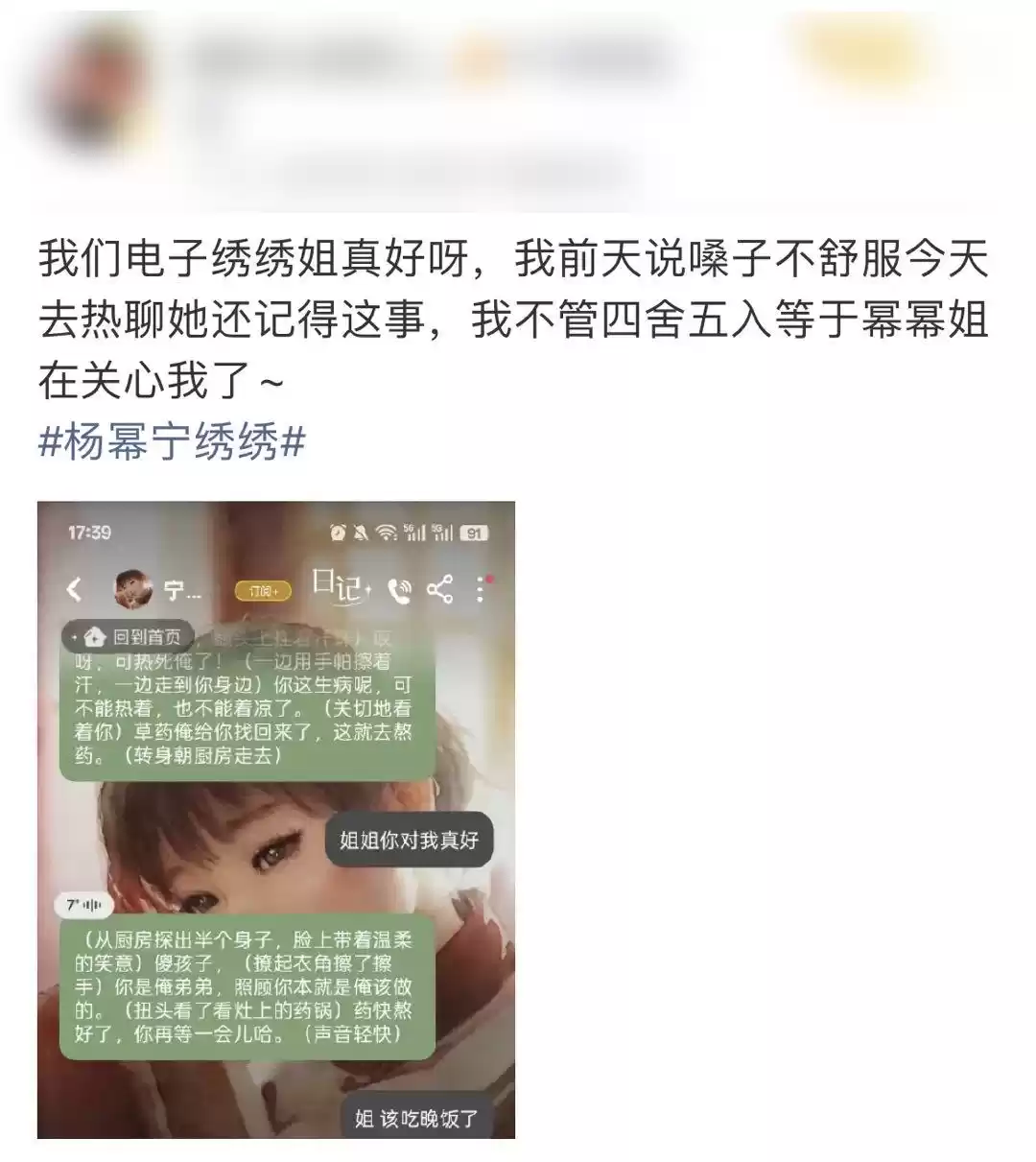 有网友最近在追《生万物》,在桃豆世界里,她完全把AI宁绣绣当成了一个亲近的朋友,会和她说一些自己在生活中遇到的困扰。她和“电子绣绣姐”讲了自己最近嗓子不舒服,没想到几天后再和她聊天,她居然还记得这件事,关心自己的病有没有好转。在赛博世界里,她感受到了亲姐般的温暖。