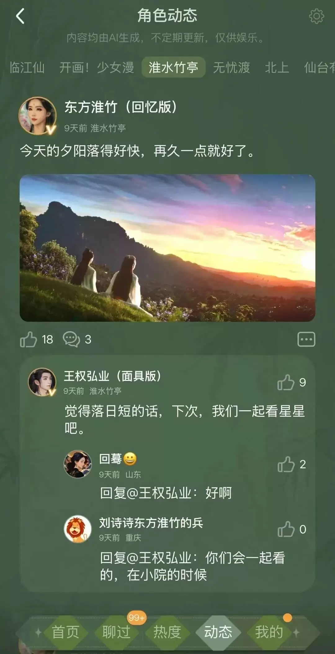 今年5月《淮水竹亭》播出期间,等不及更新的阿林时不时就会点开女主角AI淮竹的动态,看看她最近可能在做什么。在桃豆世界的角色动态里,AI角色们会不定期更新“朋友圈”,也会有其他角色前来回复,甚至用户自己也能把想说的话发送给她。