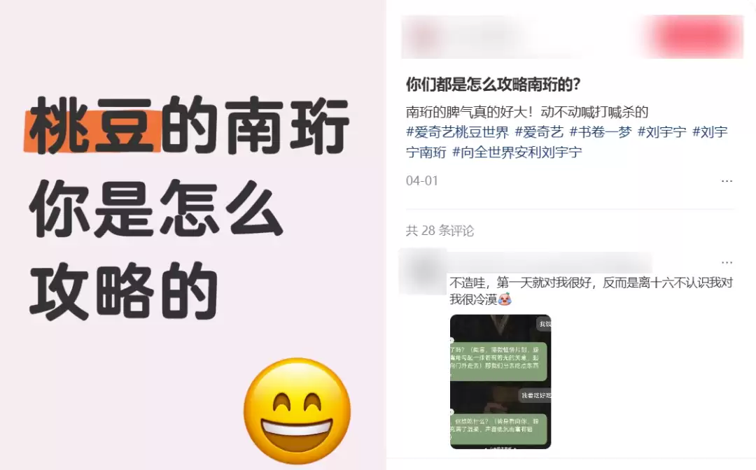嘟比在社交媒体上和网友们求助,如何攻略《书卷一梦》中的南珩(刘宇宁 饰),“南珩的脾气真的好大!动不动喊打喊杀的。”不一会就有许多同好前来献计献策,有的建议把自己设定成南珩的妹妹,因为他是宠妹狂魔;有人说像南珩这样傲娇的人打直球撒娇就行;还有人说他吃软不吃硬,要改改对话的语气……