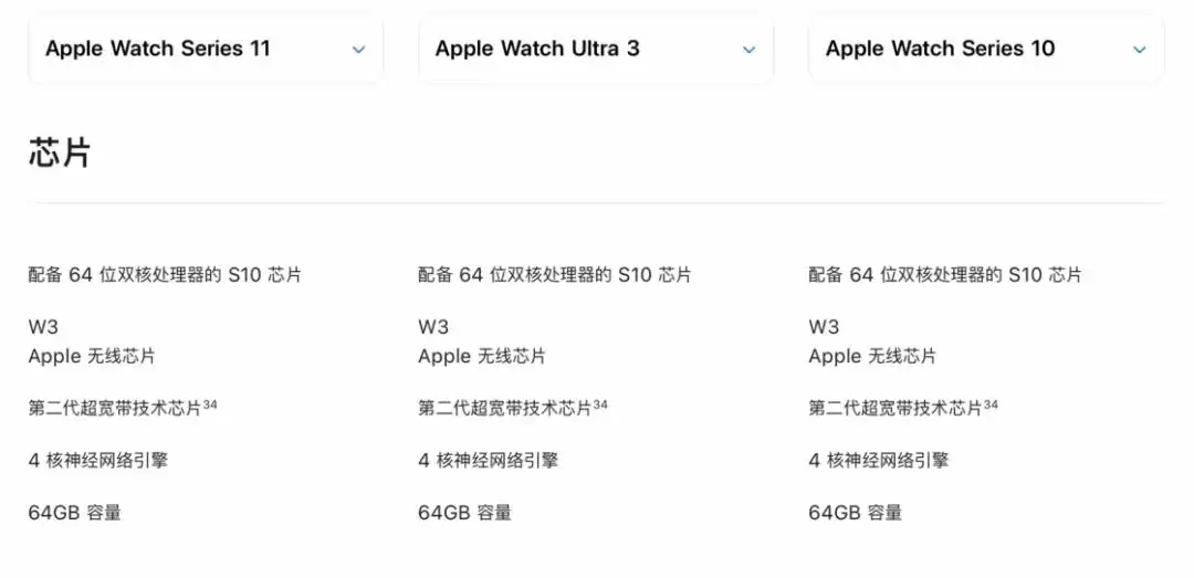 新款的 Apple Watch Series 11、Apple Watch Ultra 3 和 Apple Watch SE 使用的都是 Apple Watch Series 10 上同款的 S10 芯片。对于 Apple Watch SE 来说确实算鸟枪换炮,但对于新款 Apple Watch Series 11 和 Apple Watch Ultra 3,则显得「诚意不足」。