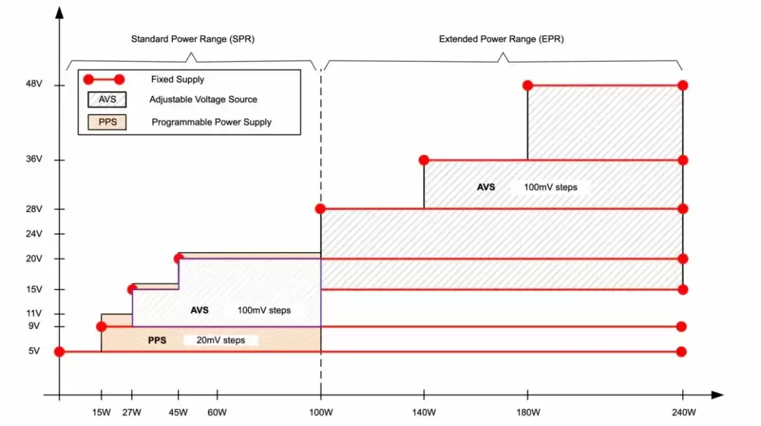 AVS 是 USB-PD 3.1 / 3.2 中的可调电压供电模式,设备端可以在指定区间内按100 mV为「步进」请求中间电压,以优化能效与发热表现。在 EPR(扩展功率范围,>100W 时)下,AVS 允许设备从 15V 起,一直到充电器所能提供的最高固定电压(如 28V、36V 或 48V)之间,按步进方式进行调节。