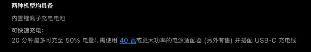 至于 iPhone Air,它依旧停留在「30 分钟最高可充到 50% 电量」这个老版描述上。除了有线充电功率略有降低,iPhone Air 的无线充电功率也被限制在了 20W,而不是 Qi 2.2 标准的 25W。要是用 MagSafe 外接电池给 iPhone Air 无线充电,功率也被限制在 12W 内。
