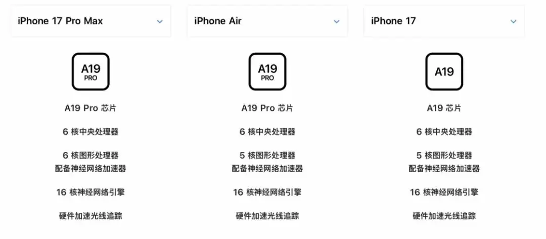 Pro 机型因具备更大的散热空间和 VC 均热板,搭载的是 6 核 CPU + 6 核 GPU 的「满血版」A19 Pro;而 iPhone Air 受限于内部空间和电池体积,只能使用 6 核 CPU + 5 核 GPU 的「缩水版」A19 Pro。
