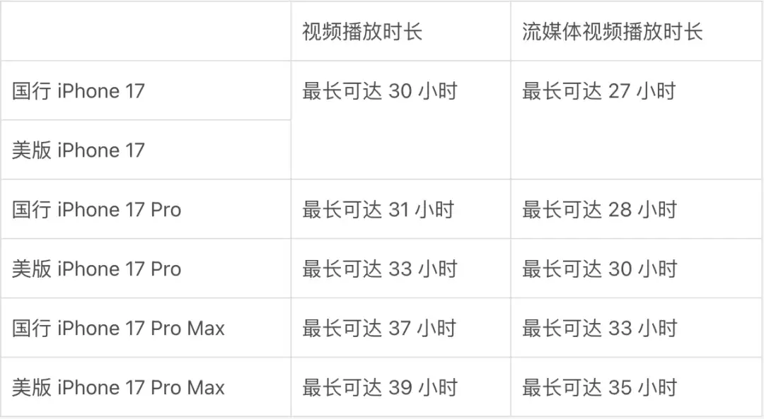 iPhone 17 Pro:美版 4252 mAh,国行 3988mAh