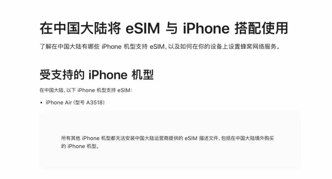 目前能在中国大陆激活 eSIM 的 iPhone,仅限国行版 iPhone Air(型号 A3518)。而外版 iPhone Air(包括港澳台版本)及其他支持 eSIM 的 iPhone,无论新旧,都无法在大陆三大运营商处注册 eSIM 服务。