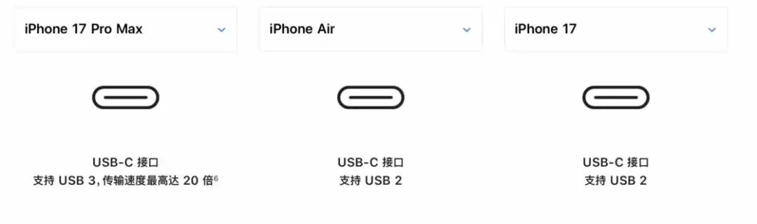 令人意外的是,即便 iPhone Air 与 iPhone 17 Pro 系列同样搭载 A19 Pro 芯片,它的传输速率却与 iPhone 17 标准版保持一致,仅支持 USB 2 的 480Mbps;且 iPhone Air 的 USB 2 并不支持 DisplayPort 视频输出功能。