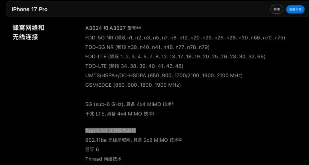 在介绍 iPhone Air 时,Apple 特别强调了自研的 C1X 基带和 N1 无线芯片。但实际上,N1 芯片并非 iPhone Air 独占,iPhone 17 全系列同样搭载。