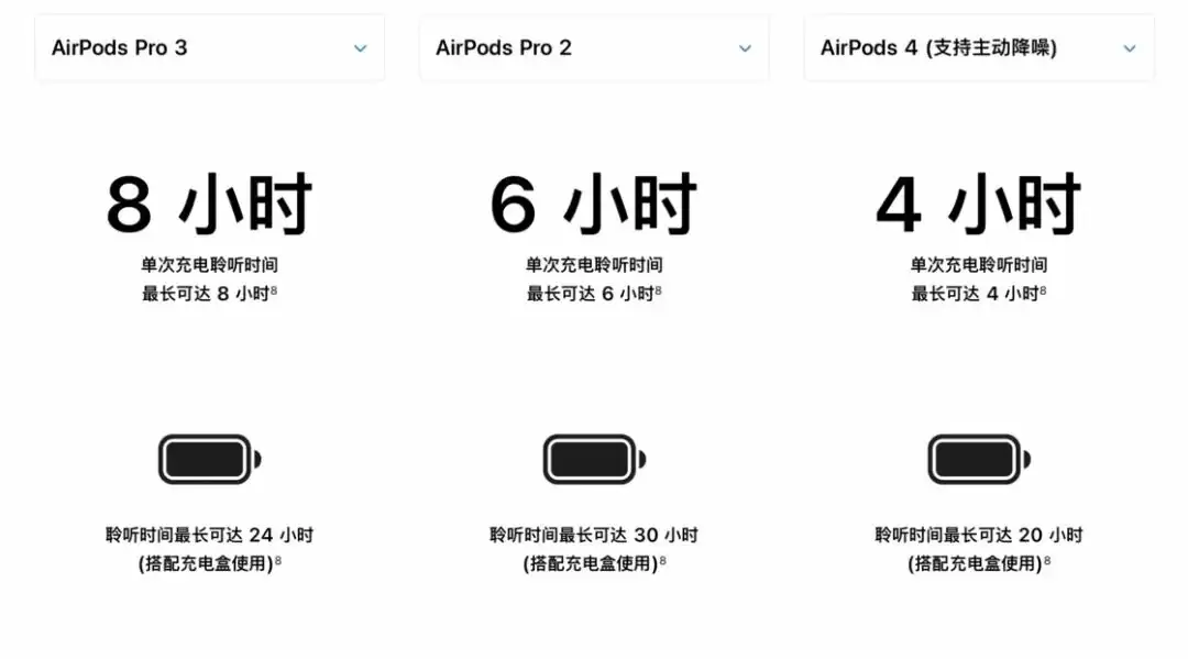 虽然 AirPods Pro 3 仍然采用 H2 芯片,但主动降噪能力和启用主动降噪的单次充电的聆听时长都有明显提升。不过根据正式数据,搭配充电盒使用的聆听时间反而从 AirPods Pro 2 的 30 小时缩短到新的 24 小时。