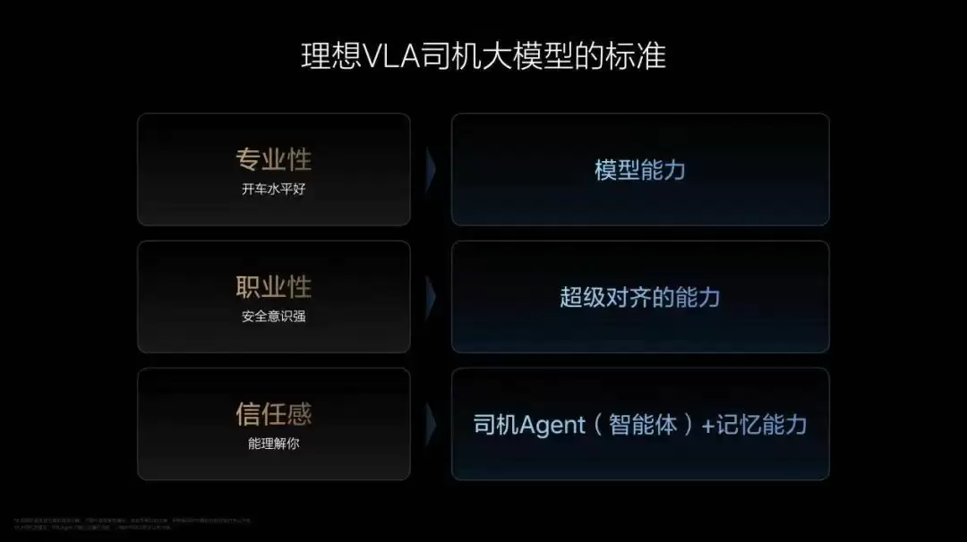一是押注确定性,几乎所有玩家都坚定选择了强化学习、世界模型的技术路径,VLA 本质上与这两者也并不冲突,在理想关于 VLA 的规划版图中,第四阶段就是基于世界模型进行强化训练,将系统打造成职业司机。
