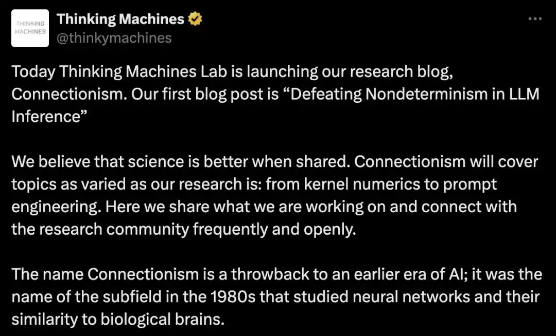 麻 将事情是这样的:今天,Thinking Machines开辟了研究博客专栏「Connectionism」(联结主义),发表了第一篇博客文章「Defeating Nondeterminism in LLM Inference」(击败LLM推理中的非确定性)。