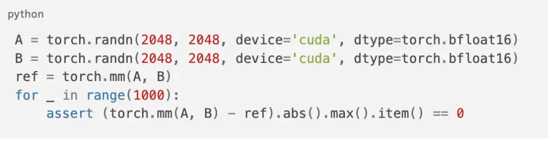 例如,即使在GPU上,对相同数据重复运行相同的矩阵乘法,也总会提供逐位相等的结果。