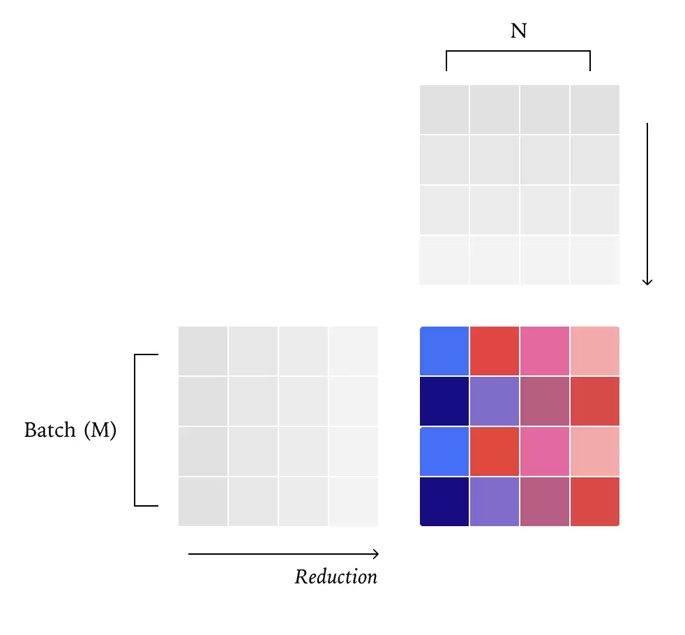 与RMSNorm不同,围绕算术强度和利用张量核心(tensorcores)的额外约束,被迫分割二维分块而不是单个输出元素进行,以实现高效的矩阵乘法kernel。