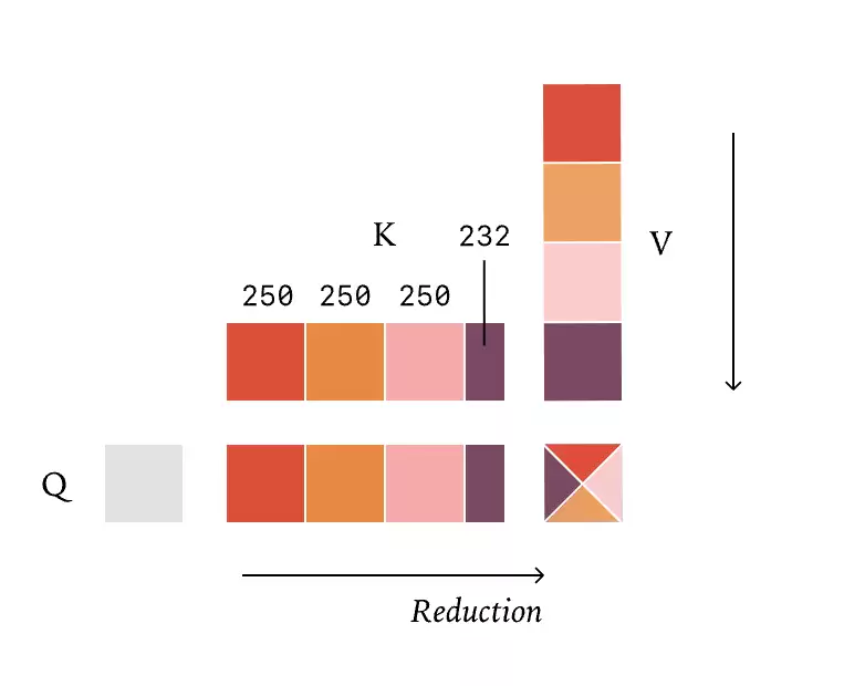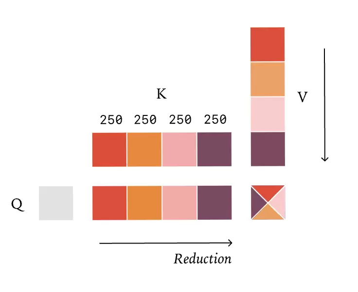 如果我们的查询长度变得非常小(就像在解码期间那样),可能会陷入一种情况,即kernel中几乎没有并行性。在这些情况下,需要再次沿着归约维度——这次是KV维度——进行分割。分割KV维度的典型策略是计算出需要多少并行性,然后均匀地划分KV维度。例如,如果KV长度是1000,我们需要4个分割split,每个核心将处理250个元素。