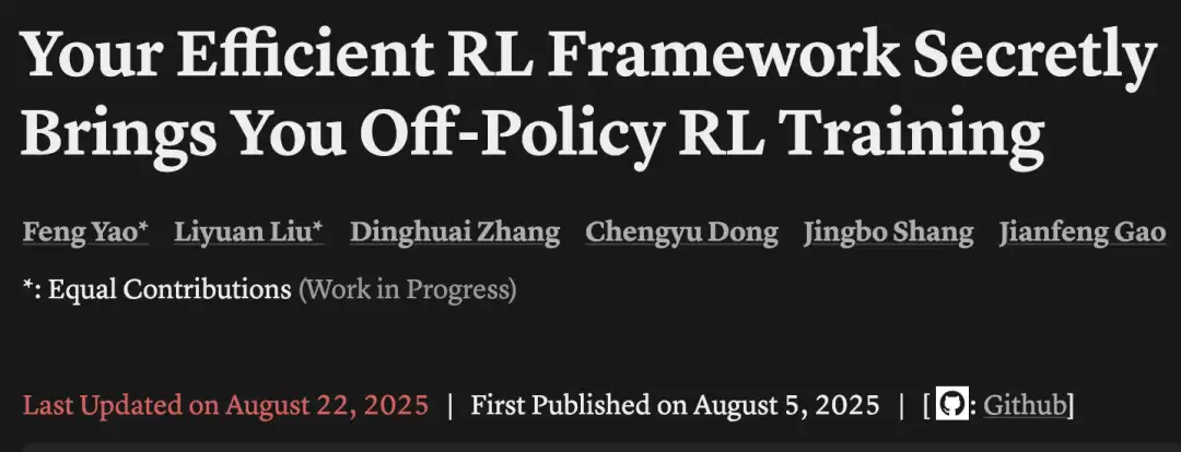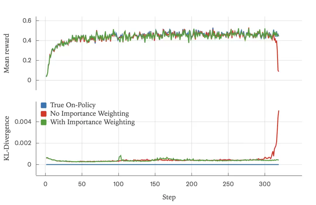 正如研究人员指出的,训练和推理之间不同的数值计算,无形中将同策略强化学习(on-policy RL)变成了异策略强化学习(off-policy RL)。