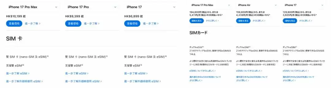 根据爱范儿查证,今年的港版看齐台版,为单实体 SIM + eSIM 的组合,日版则看齐美版,变成了全系纯 eSIM:
