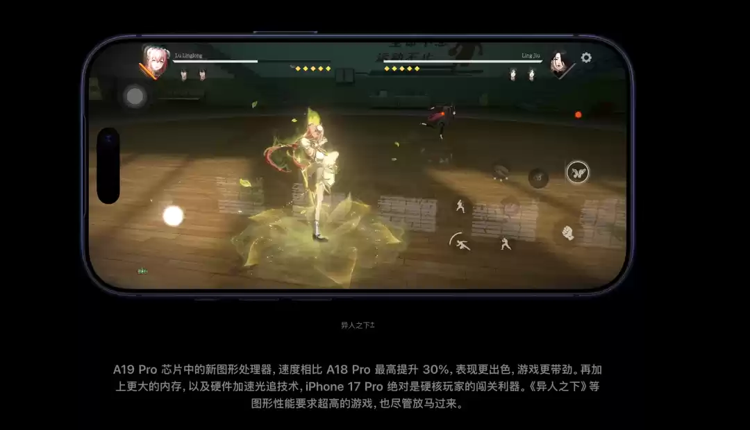 今年的发布会上,国产游戏《明日方舟:终末地》亮相,作为一款和《原神》一样的跨终端游戏,根据最新宣传片的演示,iPhone 17 Pro 的 A19 Pro 处理器能开启「PC 级的高分辨率和光追」,爱范儿在现场的观感是稳定的 1080P 高刷 + 光追,流畅得不像是 iPhone。