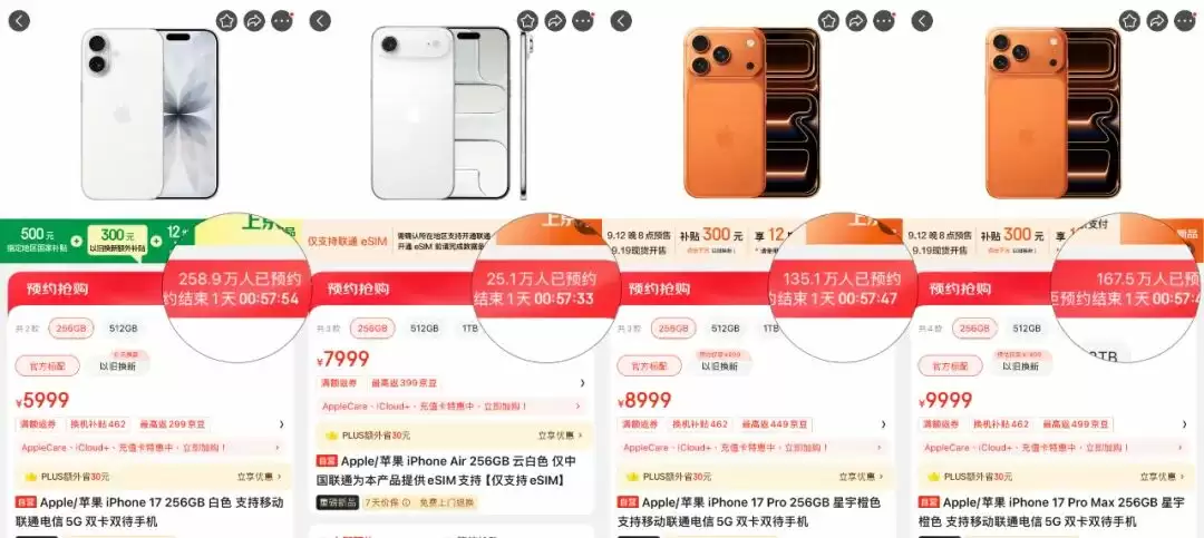 其中,iPhone 17 标准版的预约量接近 250 万一马当先,其次是最大杯的 iPhone 17 Pro Max 与 iPhone 17 Pro,而发布会前的顶流 iPhone Air 则只有 25 万——也算是一次标志性的高开低走了。