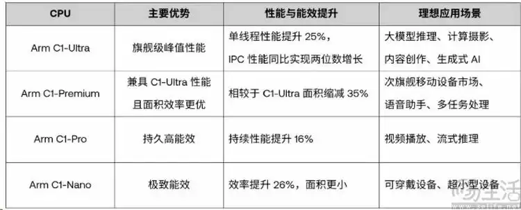 具体来说,Arm发布了四款新的CPU IP,分别是C1-Ultra、C1-Premium、C1-Pro和C1-Nano。