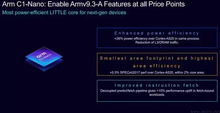按照Arm方面的说法,在SPECint2017中,C1-Nano对比Cortex-A520综合跑分提升大约为5.5%。在处理相同程序的前提下,它的能效提升了26%。