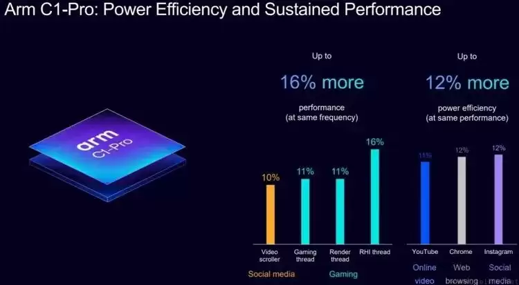 相比之下,他们对于C1-Pro的性能进步幅度给出的数据又变得具体了起来。根据Arm方面的说法,与Cortex-A725相比,C1-Pro在同等性能下的功耗要低26%;如果是达到同等功耗,那么C1-Pro的性能将可以比Cortex-A725块11%。同时如果两者均设定为相同的主频,则C1-Pro的性能最高可以比Cortex-A725高出16%。
