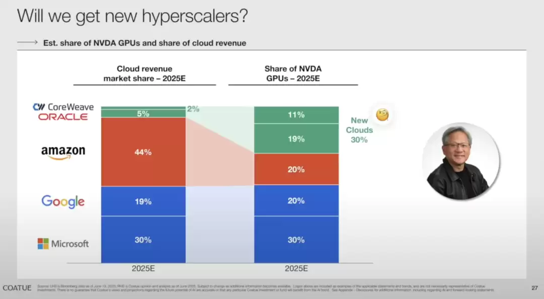 根据 Coatue 的数据,2025 年云收入份额里,三巨头加起来高达 93%。可在英伟达 GPU 的采购份额里,他们只拿走 70%。反而是 Oracle、CoreWeave 这些新玩家,收入份额不足 7%,却买走了 30% 的 GPU。