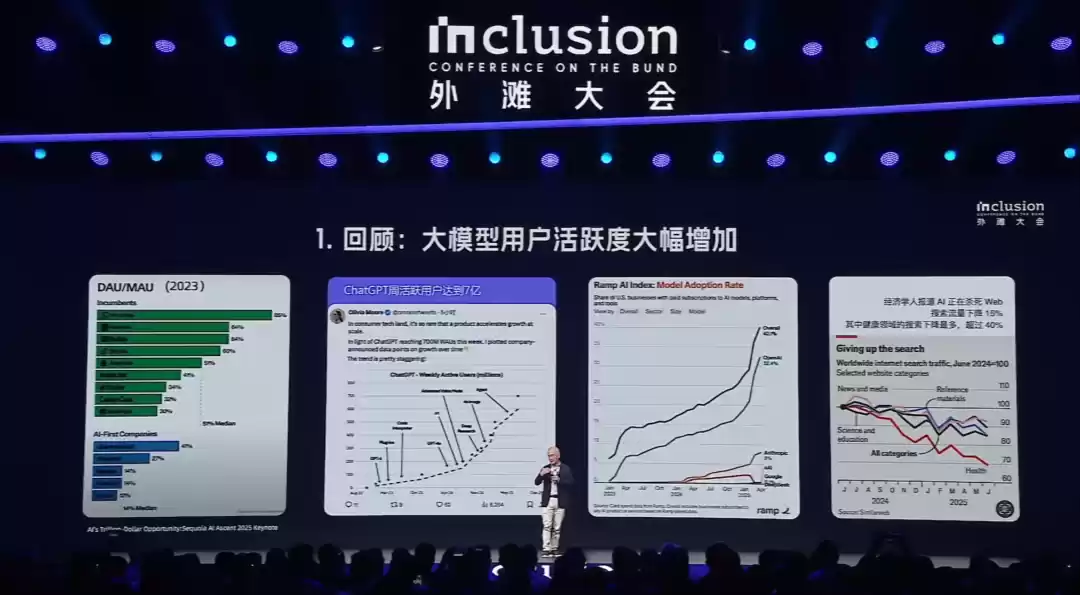大模型普及首先影响到的就是搜索的流量。经济学人的研究演示,受AI影响网页搜索流量已经下降15%,健康领域的搜索流量下载超过40%。