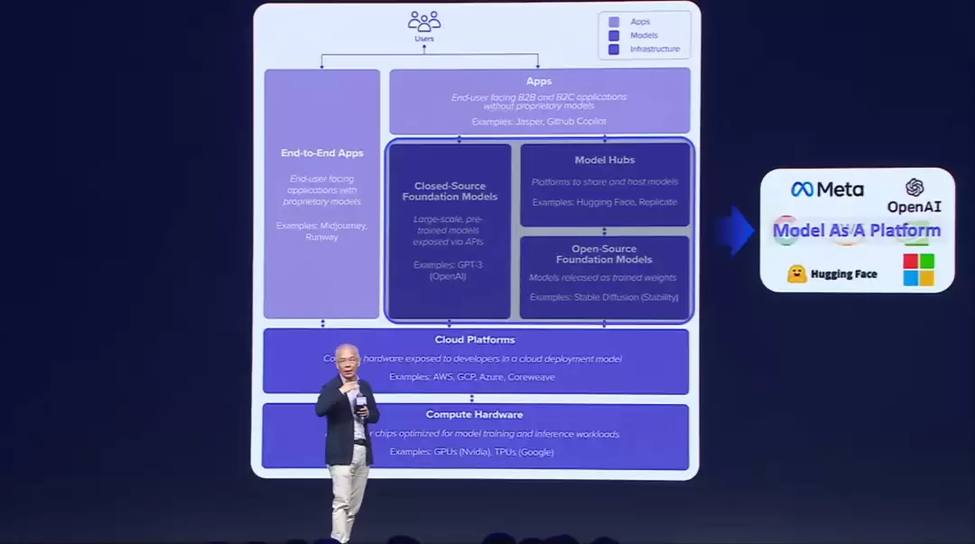 起初云厂商只是将模型作为一个服务,随后模型开始定义整个云平台并建立新的平台,就像当初的PC、iOS、云平台,这个生态一定会诞生一个完整的产业。