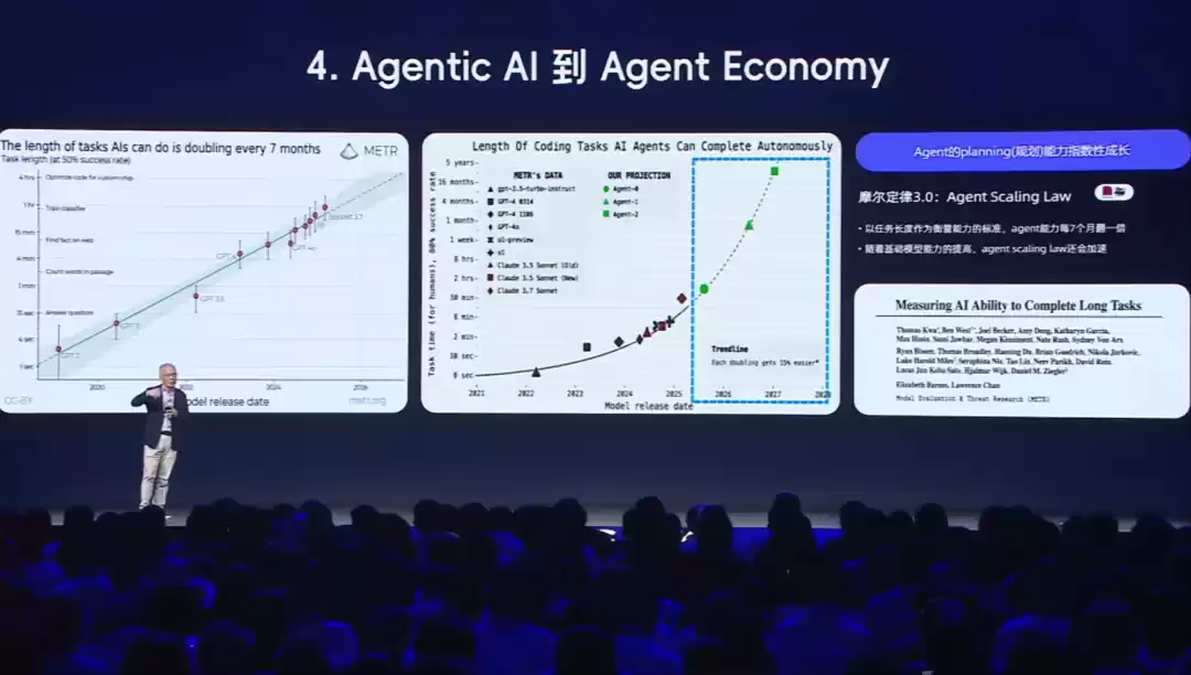 而Agent技术只有在推理模型逐渐成熟时才能出现,且成长速度现在非常快。过去12个月,推理模型思考的时间增加迅速,每六个月思考时间翻倍,也意味着思考性能翻倍。