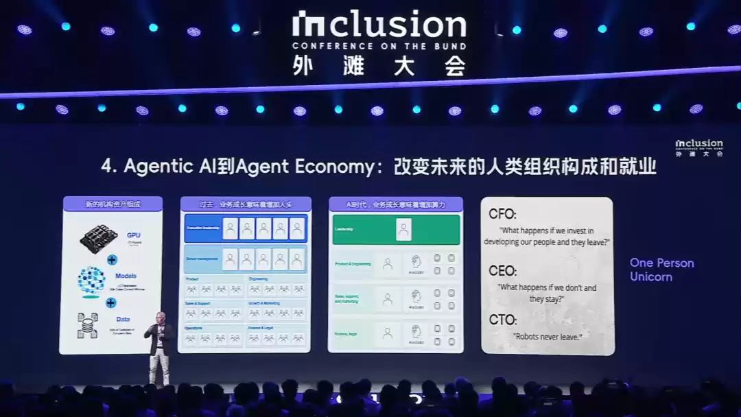 Agent经济对社会的影响在于,目前机构的重要资产是人才,未来会变成算力、模型、数据,现在企业想要扩大业务会雇佣更多人才,未来就是要扩大算力规模、模型更强大、数据更丰富。当一个人和一堆Agent组成一个公司,会实现前所未有的效率跃升。