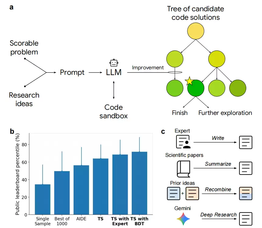 它会先生成研究思路并写出可执行的代码,然后在沙箱环境中运行,利用树搜索的方法筛选出值得深入的候选方案,再让大语言模型对代码进行反复的改写和优化。
