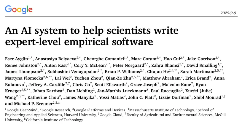 谷歌最新71页论文震惊科研界:AI不止能写代码,还能像科学家一样提出新方法、跑实验,甚至在六大领域全面超越专家!过去要花几个月的探索,如今几小时就能完成,科研节奏正在被AI改写。