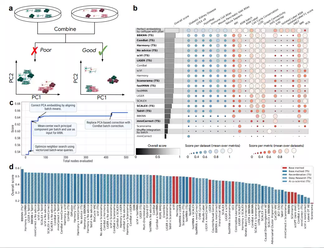 在单细胞RNA测序批次整合任务上,AI系统自动组合方法,整体得分超过现有专家工具
