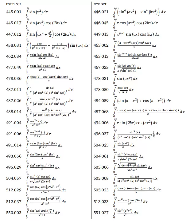 数值积分任务的部分示例。谷歌系统在19个测试积分中成功求解了17个,而标准数值方法未能给出结果。