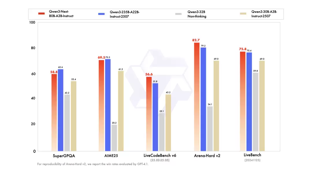 具体来看,其指令模型表现优于Qwen3-30B-A3B-Instruct-2507和Qwen3-32B-Non-thinking,并取得了几乎与参数规模更大的Qwen3-235B-A22B-Instruct-2507模型相近的结果。