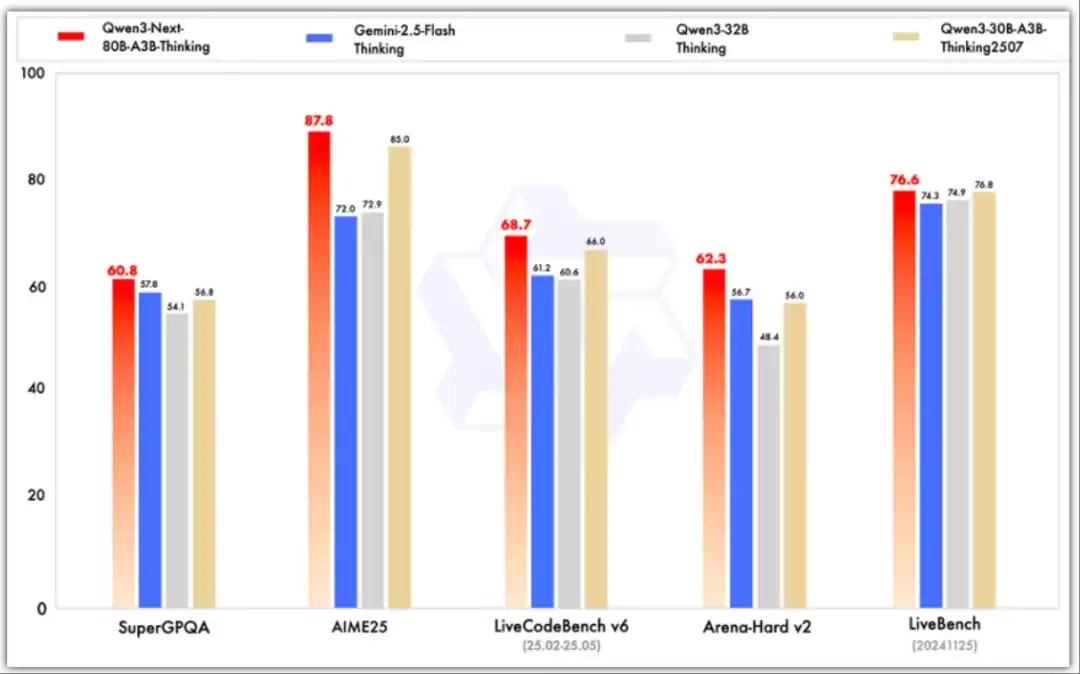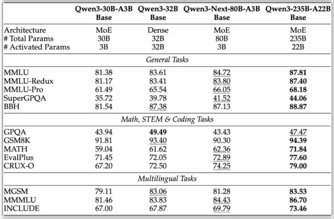 其基座模型为Qwen3-Next-80B-A3B-Base,仅使用1/10的Non-Embedding激活参数,在大多数基准测试中,性能表现与Qwen3-32B-Base相近。但其总训练成本为Qwen3-32B-Base的10%不到。