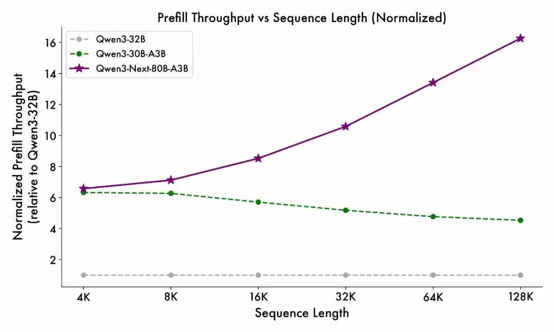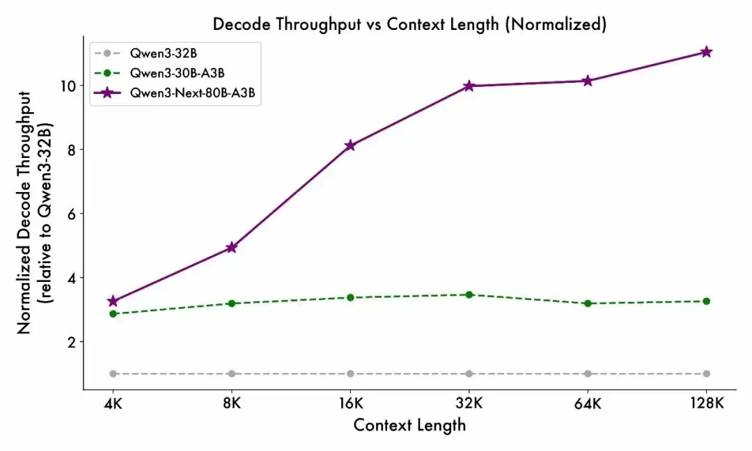得益于其新的混合模型架构,Qwen3-Next在推理效率方面,与Qwen3-32B相比,Qwen3-Next-80B-A3B在预填充(prefill)阶段,在4k tokens的上下文长度下,吞吐量接近前者的7倍,当上下文长度超过32k时,吞吐量提升达到10倍以上。