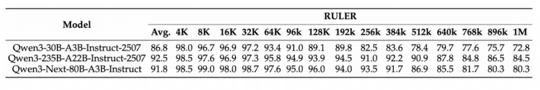 Qwen3-Next-80B-A3B-Instruct在RULER上所有长度的表现明显优于层数相同、注意力层数更多的Qwen3-30B-A3B-Instruct-2507,甚至在256k范围内都超过了层数更多的Qwen3-235B-A22B-Instruct-2507。