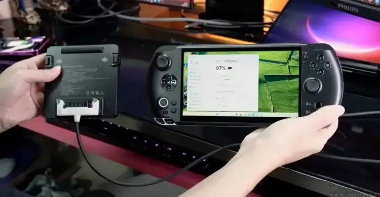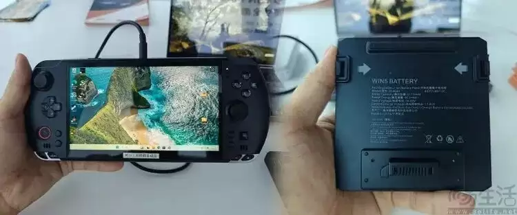 说到这里,显然就有必要先给大家来科普一下此事的背景。因为现在大家看到,这台明显使用一根充电线连接到外置电池包上的设备,首先它并不是手机、而是一台PC掌机。
