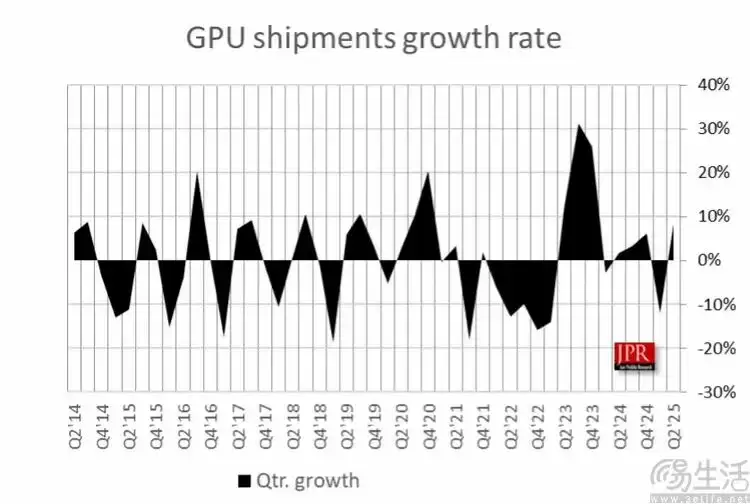 那么能将这种设计的“过错”,完全归咎于小厂的无奈吗?似乎也并不能。因为从统计机构JPR最近刚刚发布的PC市场报告来看,2025年第二季度全球PC市场的GPU出货量和独立显卡覆盖率,都有着相当可观的提升。