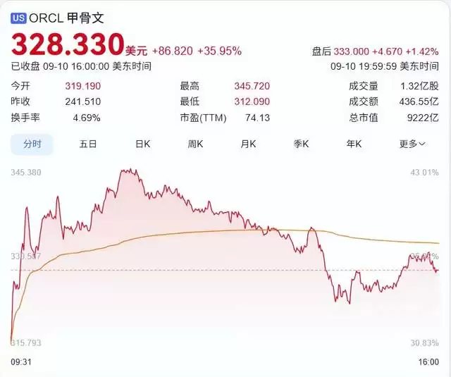 甲骨文公司股价盘中暴涨超42%,单日市值暴增2440亿美元,其81岁的联合创始人埃里森,身家一度飙升至3930亿美元,短暂超越了马斯克的3850亿美元。