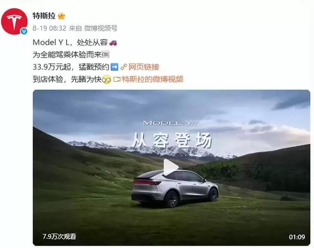 8月19日,特斯拉中国官网上线Model YL六座SUV,起售价33.9万元,这一价格较此前市场预期的40万元更具竞争力。