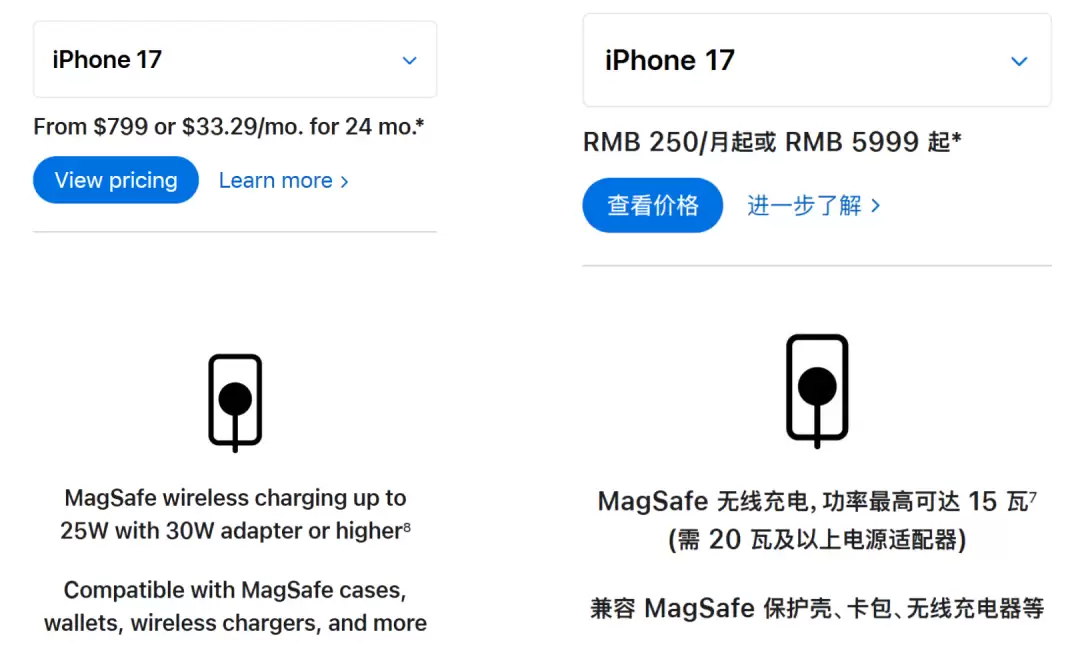 看完发布会后托尼发现了一个细节,国行和外版的 iPhone 17 ,在 Magsafe 充电功率上有区别,国行是 15W ,而外版是 25W 。