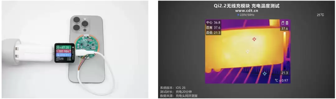 我们的同行充电头网曾经测试过一个没上市的南芯 Qi2.2 充电模块,充一台 iOS 26 系统的 iPhone 16 Pro ,无线充的输入功率跑到了 24.22W ,充电过程中手机的最高温度 37.6 摄氏度。